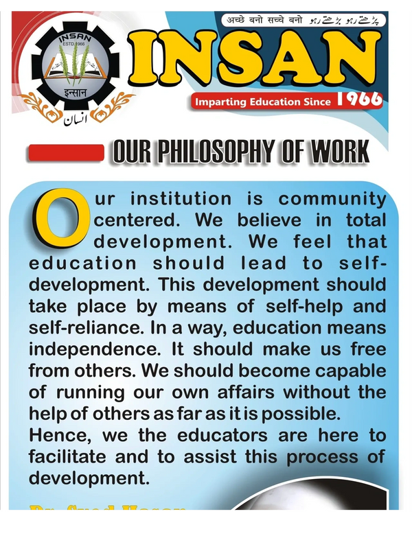 We welcome you to the family of Learners in INSAN College, which was established for the promotion of Education among all section of society. The Programs that are innovative and relevant to the society, which are offered with moderate cost and modern facilities. Bouquet of various streams of disciplines offering various courses in the area of Arts, Science & Commerce including Information Technology, Communication & Employable skills is an opportunity for aspiring students. We extend you a he